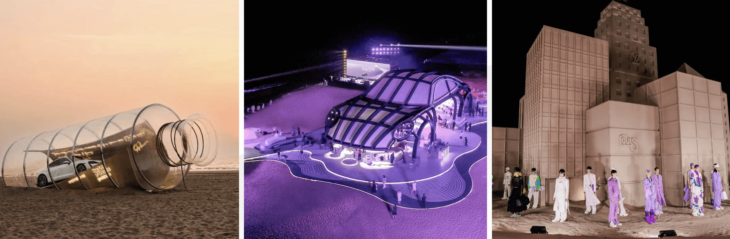 Hosts Porsche pop-ups, Hermès art weekends, and Vogue events on the beach